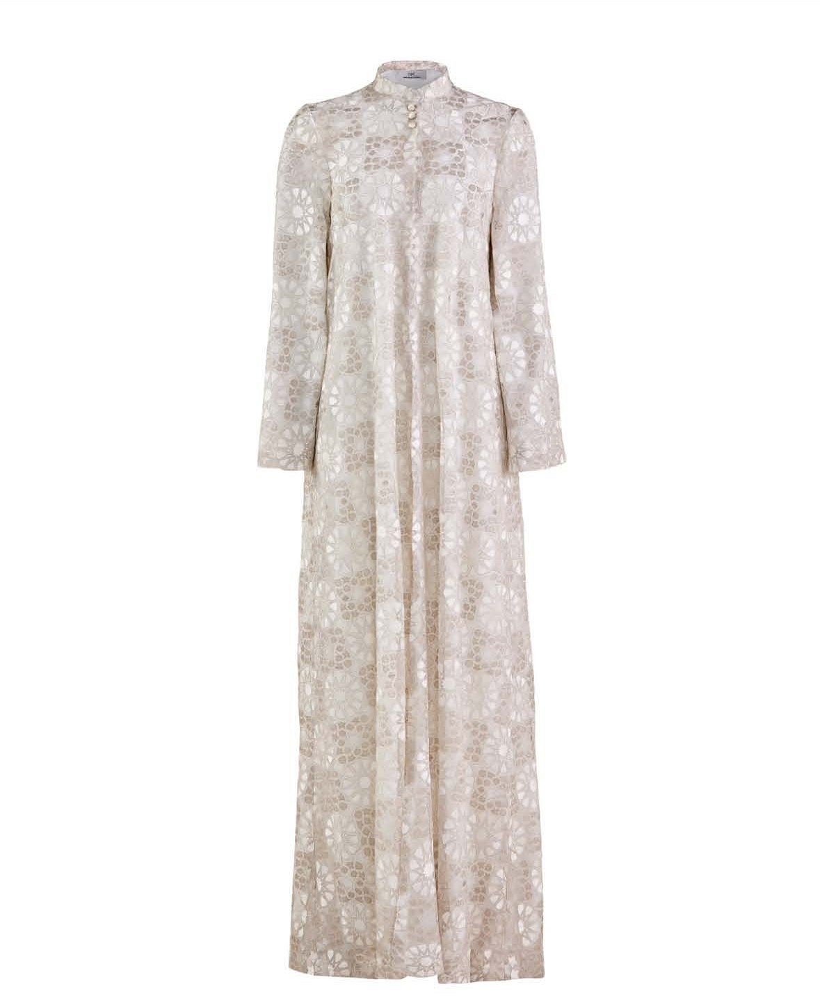A timeless and refined abaya designed with elegance and artisanal craftsmanship in mind. This open-front silhouette is delicately embroidered with silk threads, creating a sophisticated pattern that enhances the lightness and fluidity of the piece. Fully lined with opaque crepe, the abaya offers comfort, coverage, and a graceful drape. It comes with a matching off-white crepe slip dress, allowing for a seamless and elegant layered look suitable for both day and evening occasions.