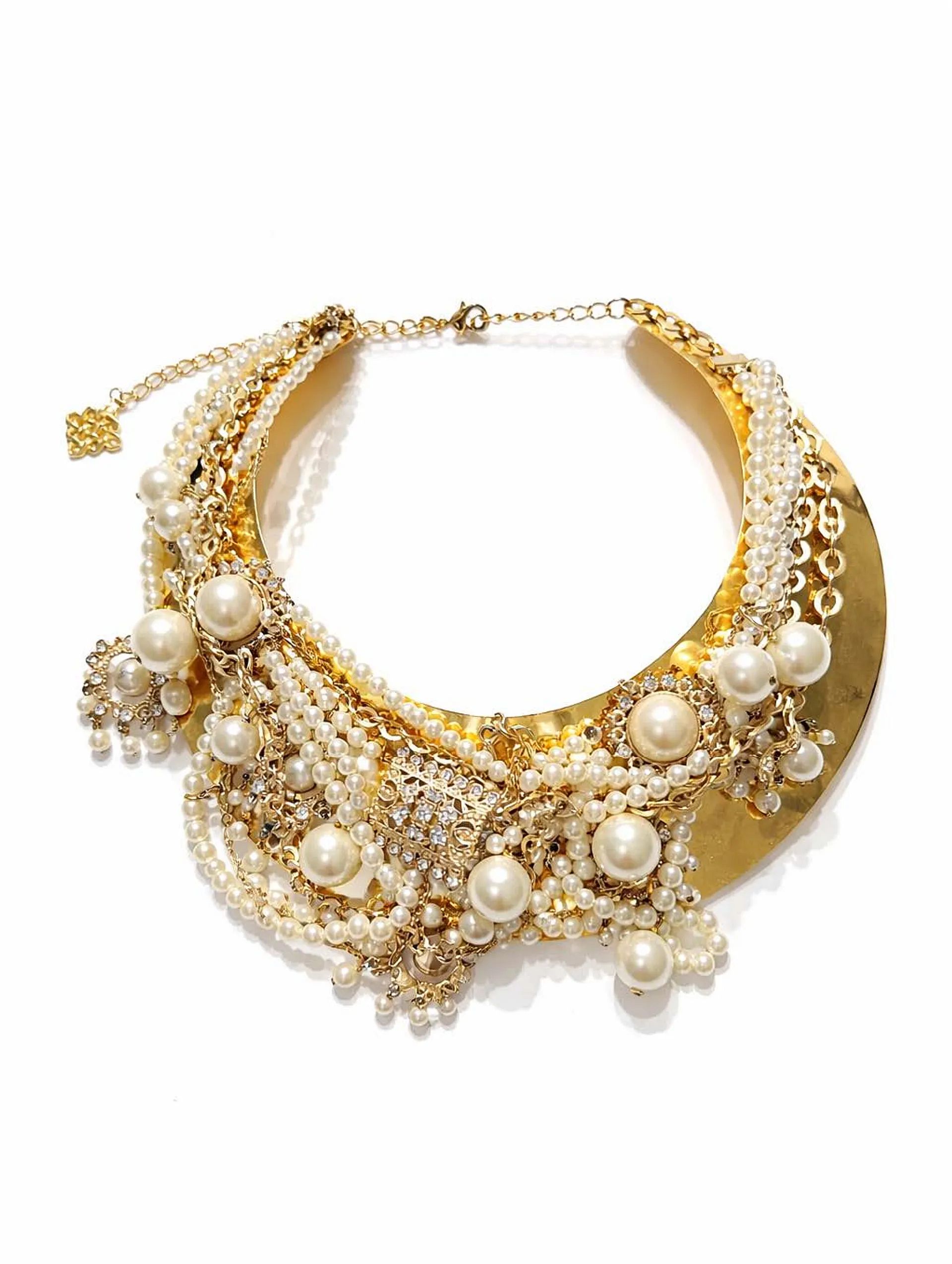A bold couture necklace designed to make an unforgettable statement. This opulent collar blends sculpted gold-tone metal with cascading layers of luminous pearls and delicate crystal embellishments, creating a rich interplay of texture, volume, and light.