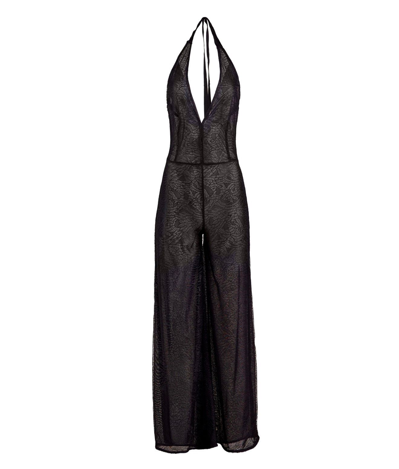 A striking expression of modern sensuality, this sheer black lace jumpsuit is designed to sculpt and elongate the silhouette with effortless elegance. Crafted from delicate patterned lace, the piece features a plunging halter neckline that frames the décolletage while creating a dramatic, elongated line through the body.