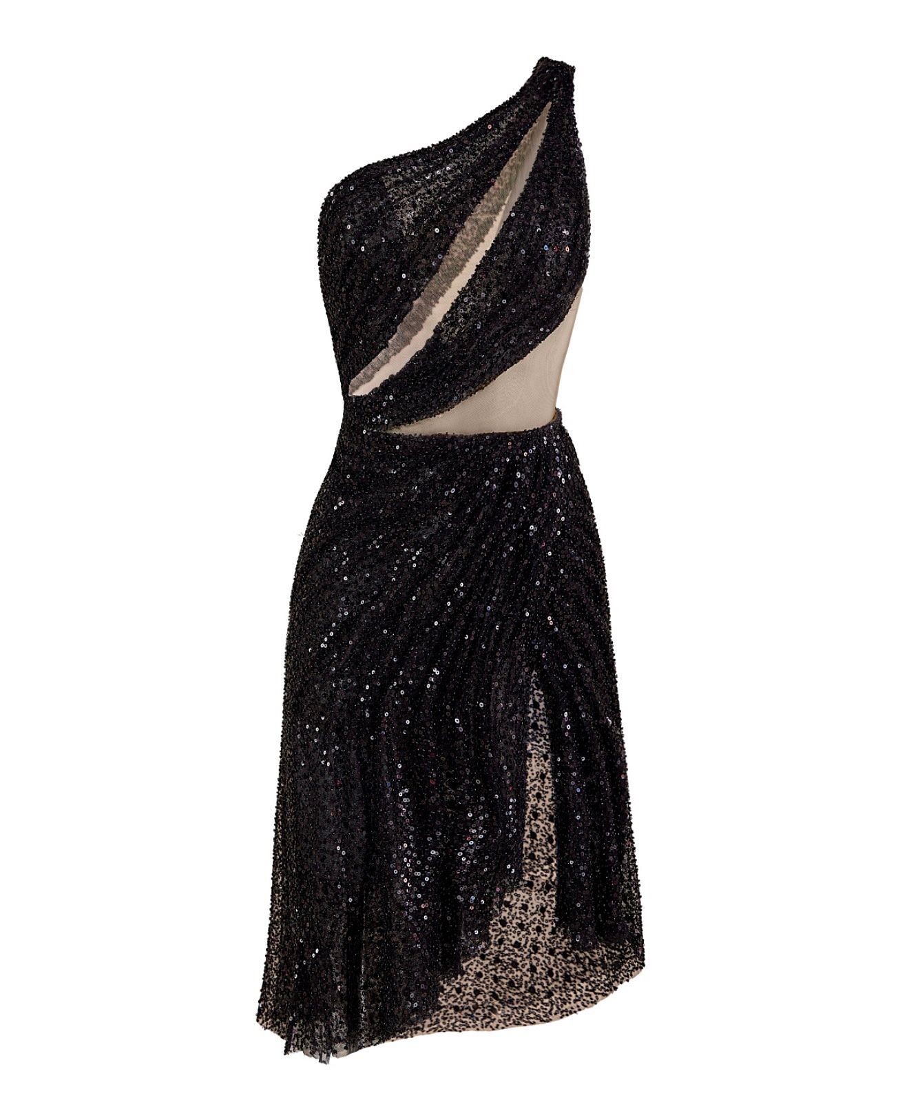 This couture one-shoulder dress is a statement of refined glamour and sculptural elegance. Crafted in black sequins with a subtle nude illusion lining, the asymmetrical silhouette reveals a bold cut-out that contours the waist and torso with precision. The draped skirt adds fluid movement and softness, balancing the sparkle with architectural finesse. Designed to catch the light from every angle, this knee-length piece is made for evenings where confidence and couture craftsmanship take center stage.