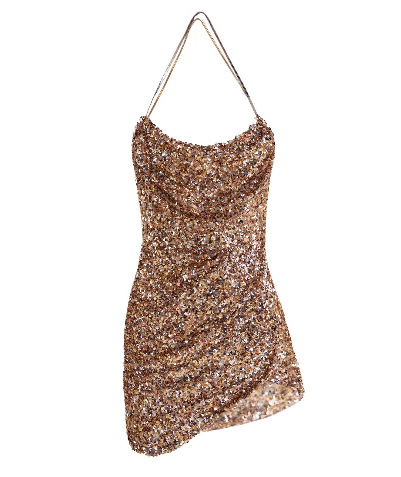 A statement mini dress designed to shimmer with every movement. This bronze-gold sequined dress features a fluid draped silhouette that softly contours the body, creating an effortlessly sensual yet refined look. Delicate metal straps add a modern, jewelry-like finish, elevating the piece from cocktail to couture. Perfect for evenings where confidence and sparkle are nonnegotiable.