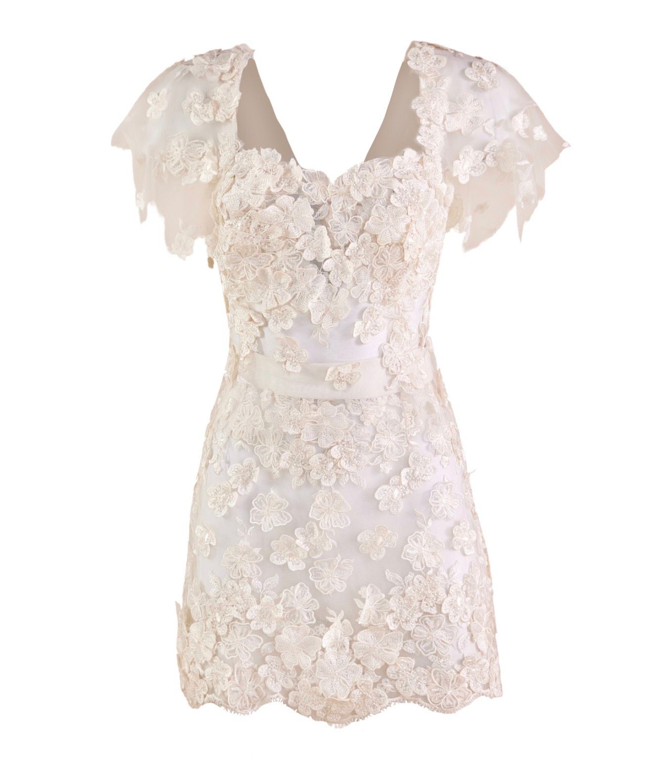 The top features short batwing sleeves in sheer tulle that gently drape over the shoulders, while the fitted bodice highlights the waist with sculptural floral appliqués. A lace-up back adds a sensual and adjustable finish. The ensemble is completed with a matching mini skirt made from the same off-white tulle and 3D guipure flowers, offering a harmonious and sophisticated look ideal for special occasions, bridal moments, or refined summer events.
