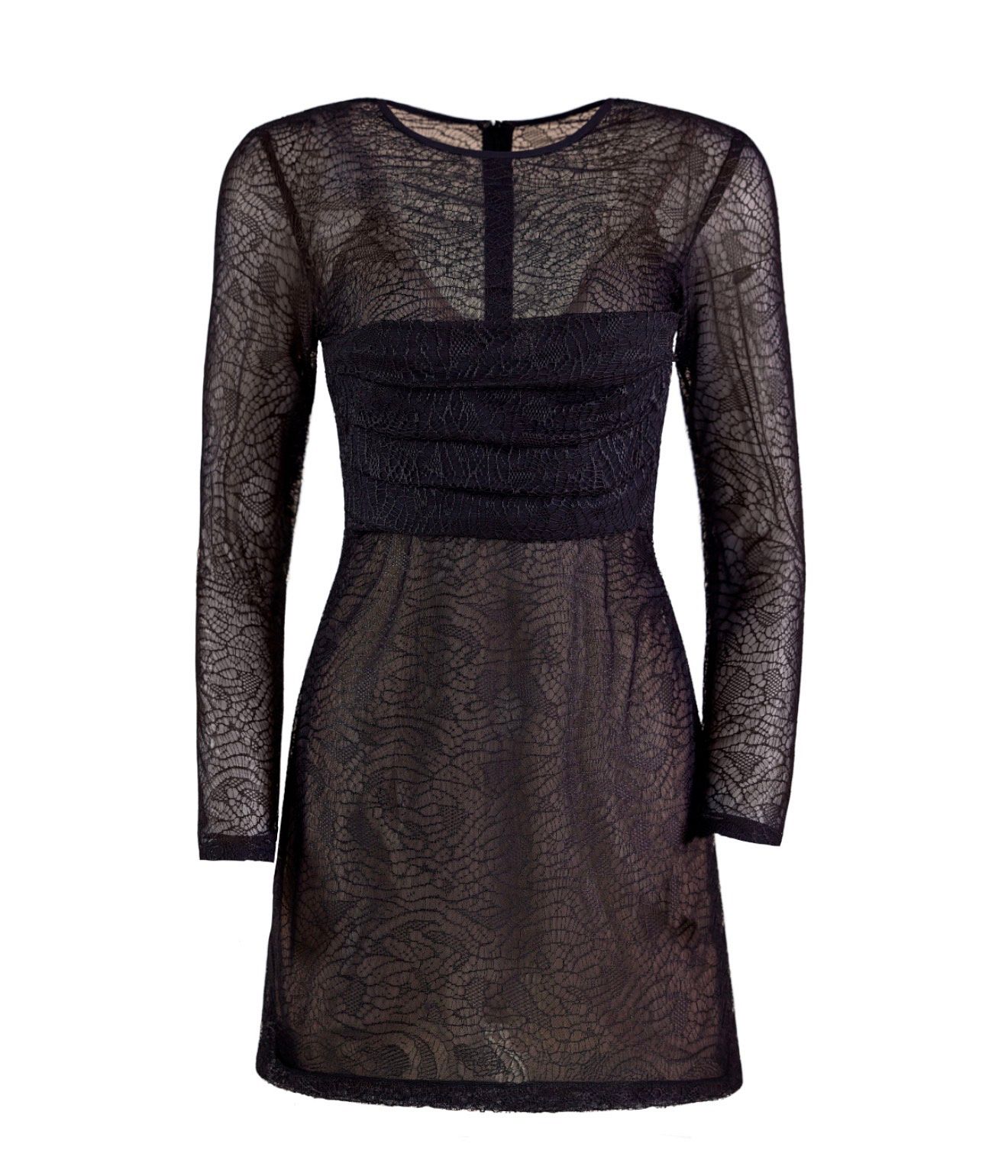 This long-sleeve sheer black lace dress is a refined expression of modern sensuality. Crafted from delicate lace, the design features a softly draped bodice that sculpts and defines the waist, creating an elegant contrast between structure and transparency. The sheer silhouette is balanced by a nude stretch beige tulle lining, offering subtle coverage while preserving the illusion effect. Designed to highlight the figure with sophistication, this piece transitions effortlessly from evening events to intimate soirées.