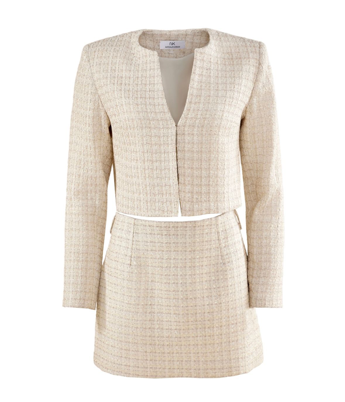 The waist-length jacket features clean lines and a refined cut that defines the waist, while the high-waisted mini skirt elongates the legs and adds a bold, modern edge. Worn together, the set creates a powerful statement; worn separately, each piece offers endless styling versatility. A signature suit designed for the woman who owns the room — unmistakably NK.